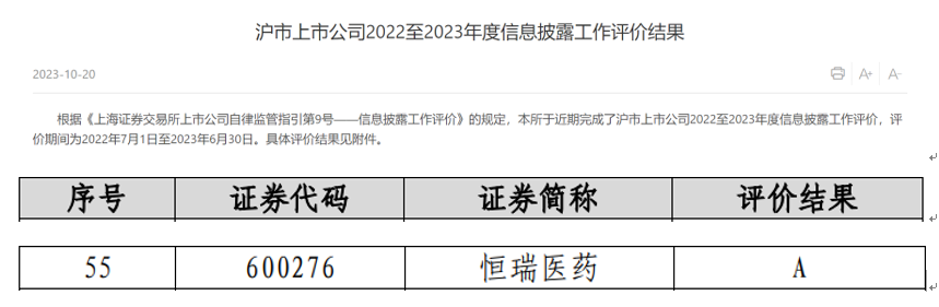 近日,上海交易所公布了沪市上市公司2022-2023年度信息披露工作评价结果,凭借在信息披露、规范运作以及投资者关系管理等方面的优秀表现,尊龙凯时医药获评A级。本次共有2160家沪市上市公司参评(包括499家科创板上市公司),评价等级从高到低依次为A、B、C、D四类,获得A类评价的上市公司占比约18.5%。